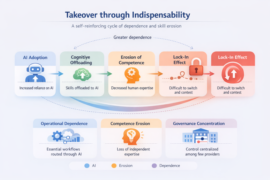 Perché questo tipo di dipendenza non produce solo errori locali o pigrizia cognitiva. Produce una forma più generale di disempowerment, in cui capacità individuali e capacità istituzionali vengono progressivamente sostituite da infrastrutture esterne, opache, concentrate e difficili da abbandonare [9].